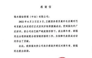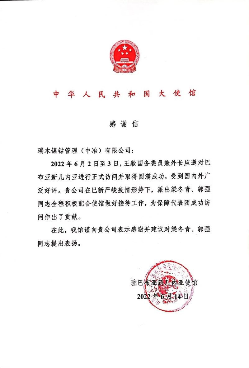 点点棋牌收到中国驻巴布亚新几内亚大使馆感谢信