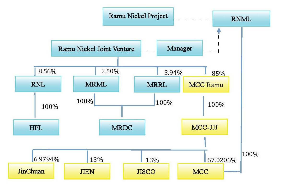 In PNG, the Project is an unincorporated joint venture between MCC Ramu (85%); MRML (2.5%) and MRRL (with 3.94%) two subsidiaries of Mineral Resource Development Corporation (MRDC) on behalf of PNG government and landowner interests; and RNL (8.56%), a subsidiary of former developer Highland Pacific Ltd. Ramu NiCo Management (MCC) Limited, as the Manager of the Project appointed by all joint venture parties, is fully responsible for construction, development and operation of the Project.